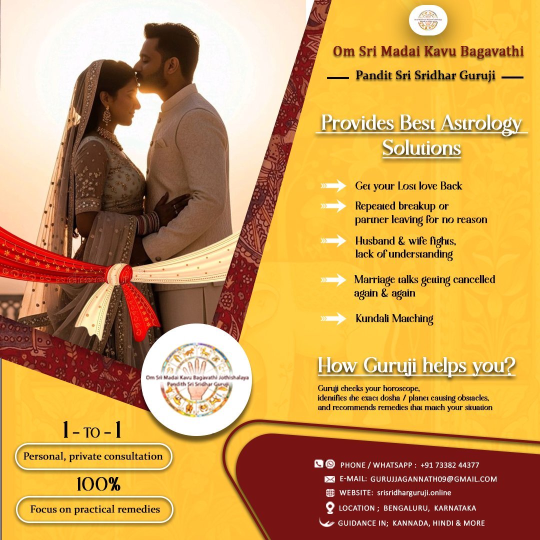 Pandit Sri Sridhar Guruji is a world-renowned spiritual guide and master of Vedic sciences, dedicated to helping individuals overcome life’s greatest obstacles through divine intervention and precise horoscope analysis. As the lead practitioner at Om Sri Madai Kavu Bagavathi, he bridges the gap between ancient Vedic wisdom and modern-day challenges, providing a sanctuary for those seeking clarity, harmony, and success. With decades of experience and a lineage rooted in sacred traditions, Guruji has become a trusted beacon of hope for thousands of devotees globally.